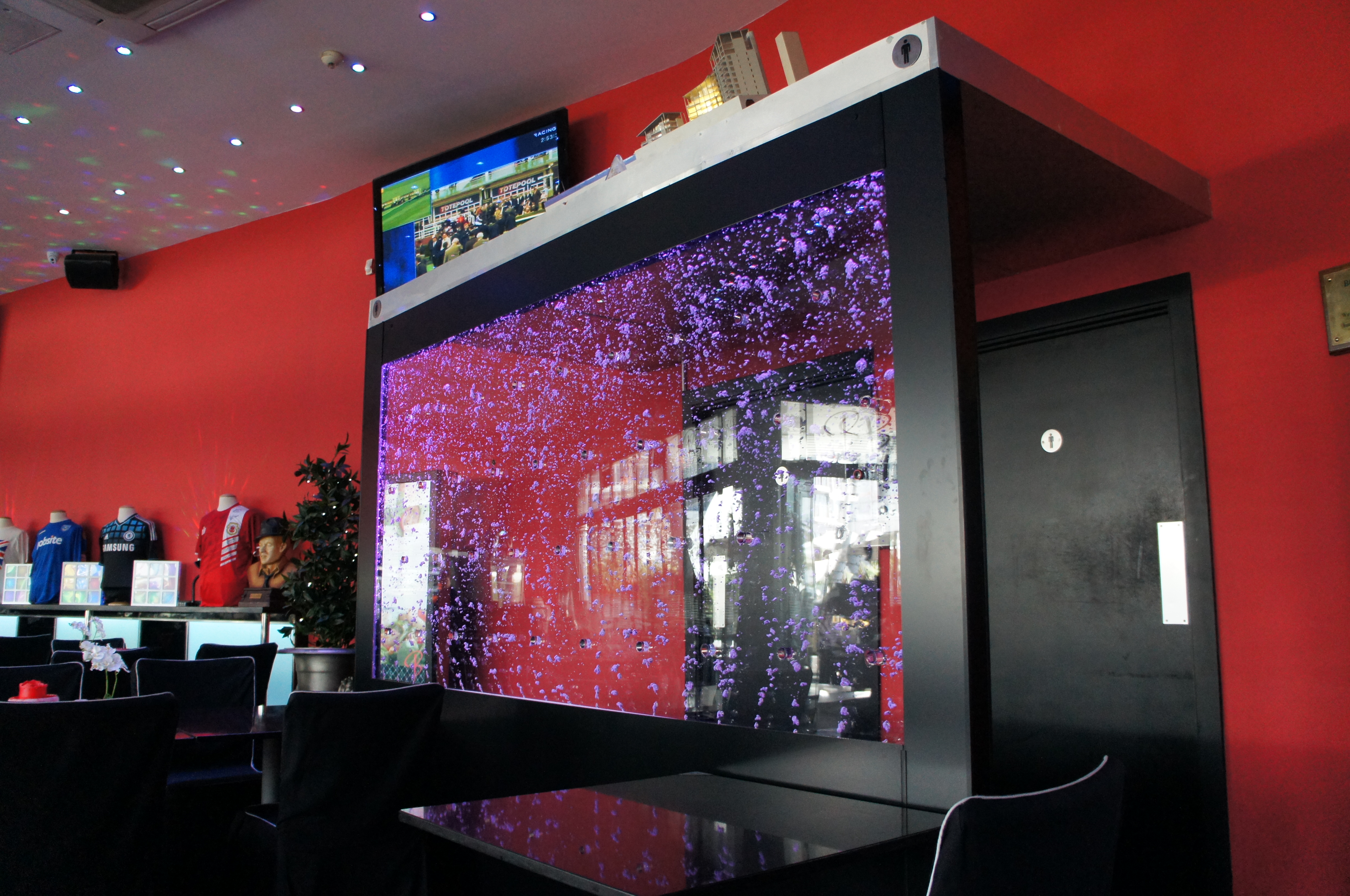 The bubble tank we supplied was situated in level with the table tops to ensure maximum effect whilst diners are seated, and bubbles surfacing well above head height for customers walking by.