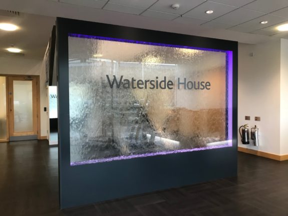 H2o designs Finished photos of last weeks water fall feature we did for Howarth Homes head office at their Waterside House location. Double sided branded feature in the main entrance to the building with matching coloured claddings to the RAL 7016 of the company logo. Sunk into the floor to give stability on such a […]